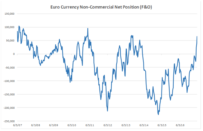 Financials - A friend brought to my attention the spec (non-commercial) positioning in the Euro yesterday, and I’ve attached a 10-year history below. It is catching some attention because as you can see the net long position in the Euro is near the highest it has...